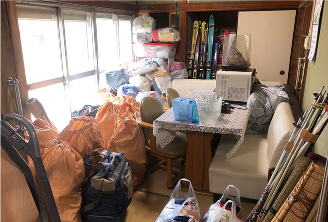 こたつ机、化粧台、小ダンス、テレビ、テレビ台、折りたたみベッド、洋服掛け、マッサージチェア、ハンガーラック、健康器具、電子レンジ、小棚、45リットル袋2個(衣類)
